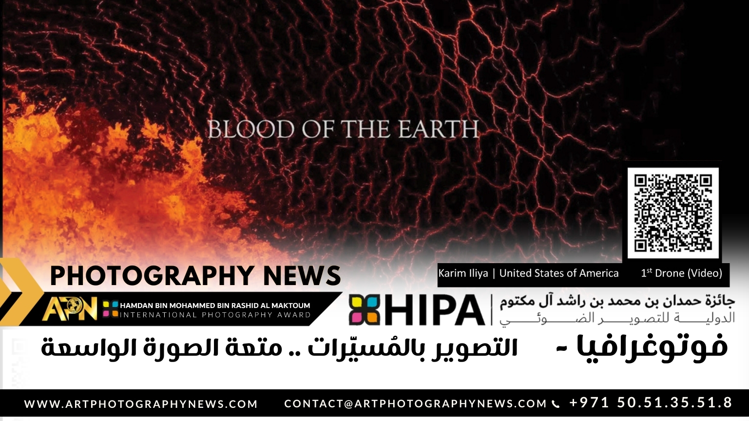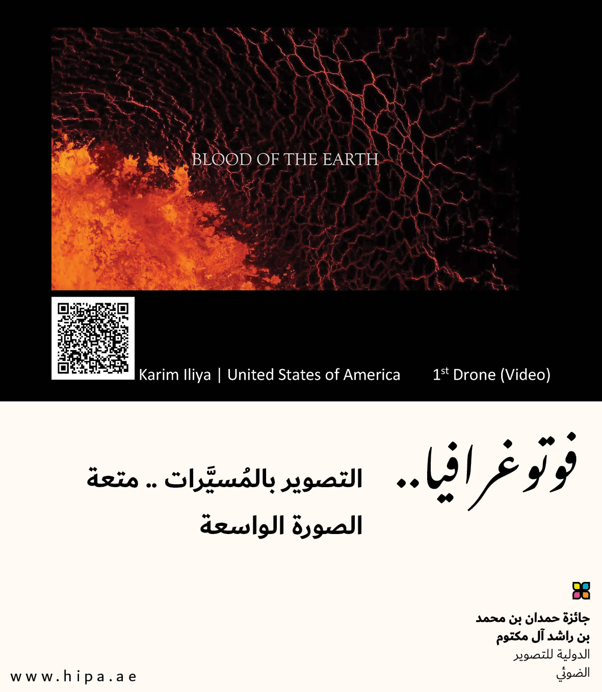 معالي / عبد الرحمن بن محمد العويس، وزير شؤون المجلس الوطني الاتحادي، رئيس مجلس أمناء الجائزة، قام بتكريم الفائزين بمحور التصوير بالمُسيَّرات (فيديو)، حيث حصد المركز الأول المصور الأمريكي “كريم إيليا”، بعملٍ بعنوان “دم الأرض” تم تصويره فوق بركانِ “فاغرادالسفيال” في آيسلندا، حيث تتفجّرُ الحِممُ المتوهّجةُ من جوفِ الأرضِ كالأنفاس الغاضبة، تنفثُ نارها فتُعيد نحت ملامح الوادي من جديد. تلك القوة الأسطورية التي تجمعُ بين الخَلقِ والفناء، تَهبُ الحياةَ كما تَبتلعُها، وتفيضُ من أعماقها بما يشبهُ دمَ الأرض الجاري في شرايينها العميقة.