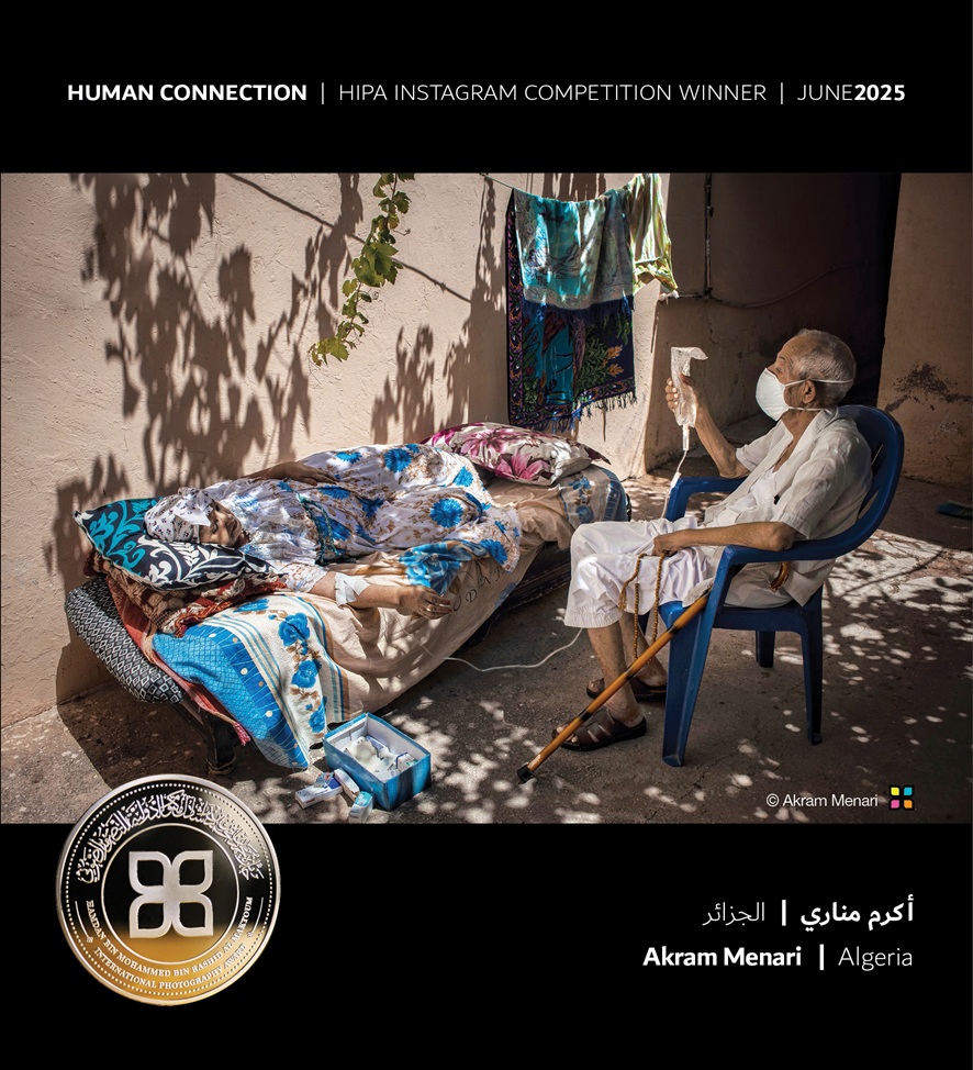 المصور الجزائري “أكرم مناري” @akrammenari الذي قام بالتقاط صورة لجدِّه الراحل خلال اعتناءه بزوجته خلال جائحة كورونا، حاملاً محلولاً وريدياً بمحبةٍ غامرة وعزيمةٍ لا تلين.