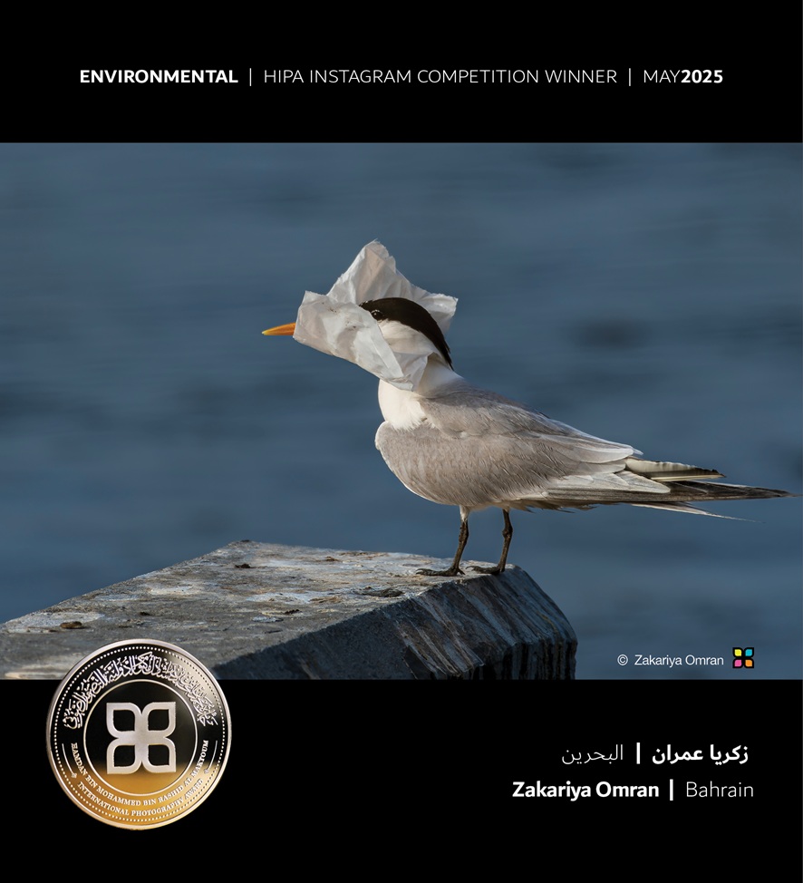 ” للمصور البحريني “زكريا عمران” @zakariya_omran بعنوان “العمى البلاستيكي” نشاهد فيها طائر النورس فاقداً للرؤية بسبب كيسٍ بلاستيكي ملفوف حول رأسه ! كرمزٍ صارخ للإهمال البشري الذي يُجسّد النتائج الكارثية للتلوث البلاستيكي.