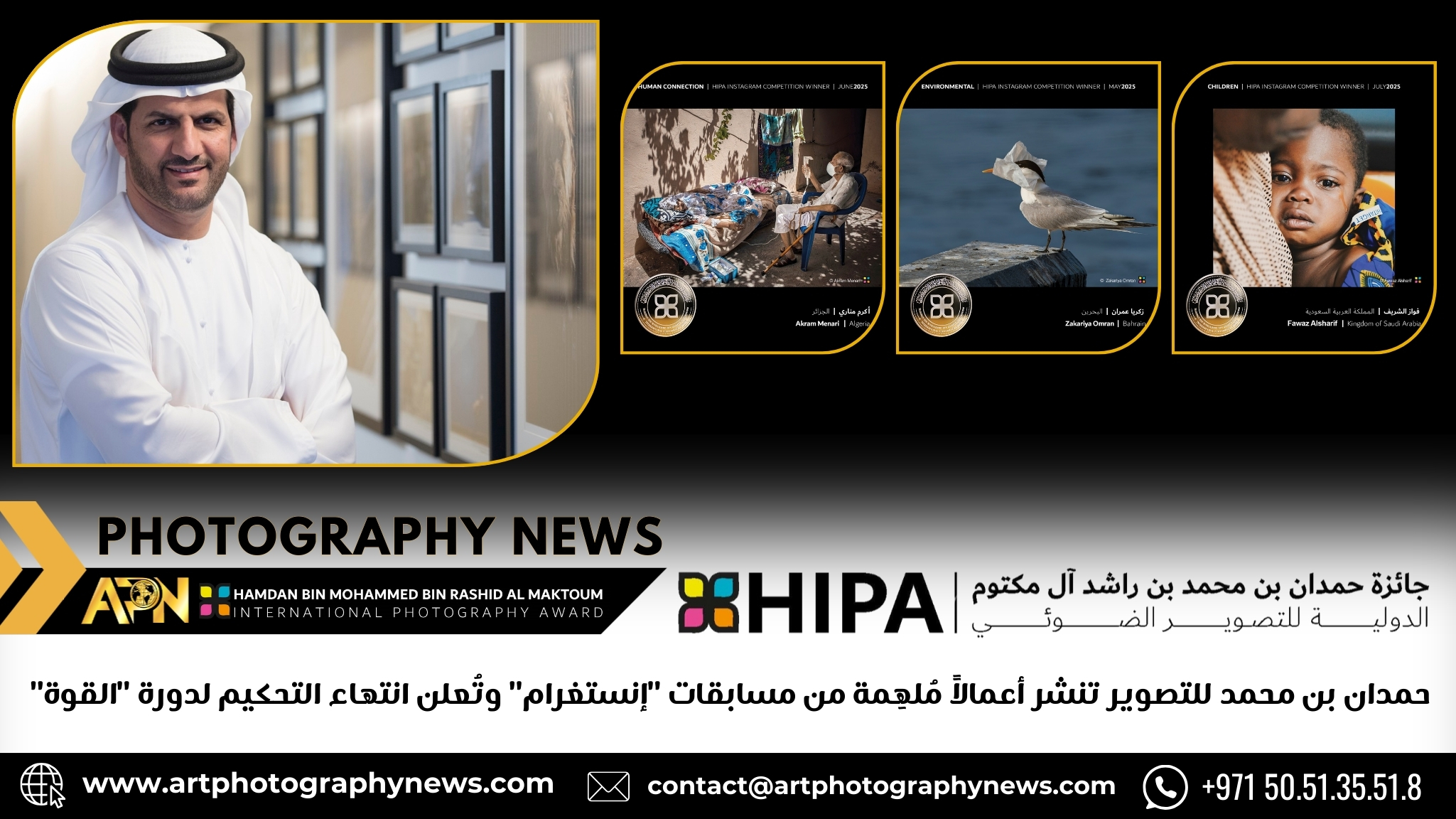 نَشَرتَ الأمانة العامة لجائزة حمدان بن محمد بن راشد آل مكتوم الدولية للتصوير الضوئي، صوراً مُلهِمة مُنتقاة من الأعمال الفائزة بمسابقات إنستغرام المطروحة خلال العام الحالي 2025، وهي مسابقات “بيئي”، “بصمة إنسان”، “الأطفال”. وكعادتها، تلقّت الجائزة آلاف المشاركات من مجتمعات المصورين الهواة والمحترفين وتم اختيار الفائزين من القوائم القصيرة لكل مسابقة.