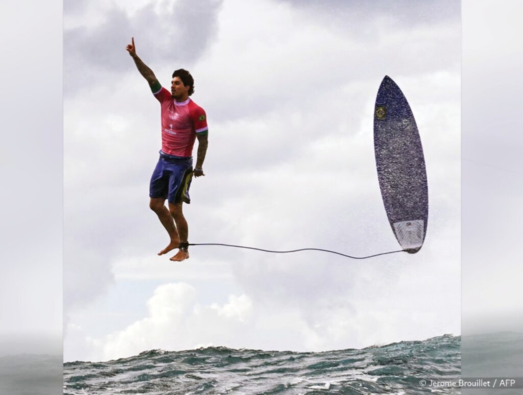 راكب الأمواج البرازيلي “غابرييل ميدينا”، أصبح صاحب الصورة الأكثر انتشاراً على المنصات الإعلامية، البعض اعتبرها الصورة الأكثر إثارة في دورة الألعاب الأولمبية في باريس 2024، إذ احتفل راكب الأمواج خلال منافسات الدور الثالث بتأهله إلى الدور ربع النهائي في منطقة “تاهيتي” الفرنسية، من خلال حركةٍ استعراضيةٍ قَفَزَ خلالها ليبدو في الصورة طائراً فوق الماء ويستقر على سحابة في المحيط الهادئ وخلفه لوح التزلج، ليحصل على 9.9 نقطة، وهي أفضل نتيجة في أولمبياد باريس حتى تاريخ كتابة المقال.