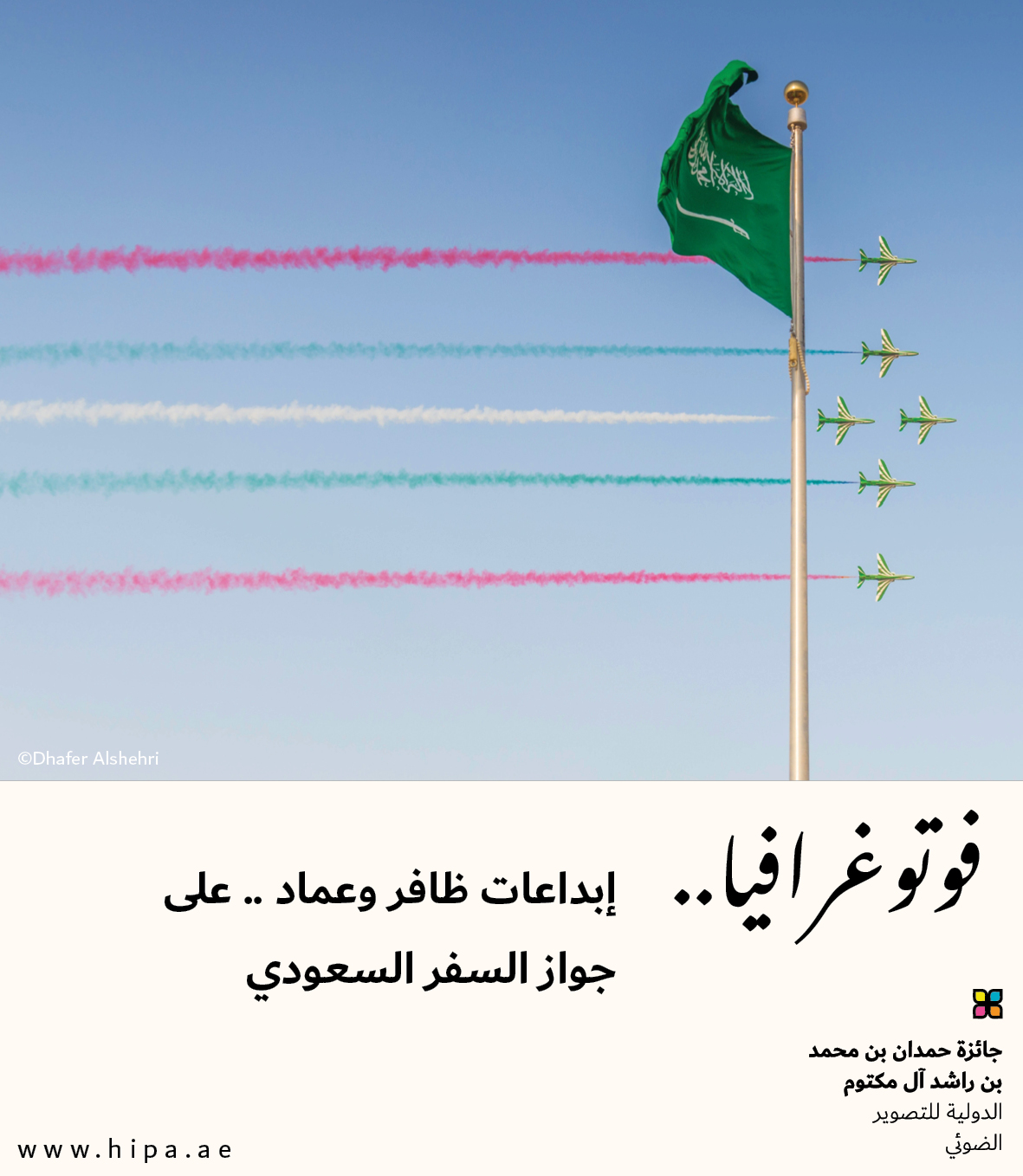 كم هو إنجازٌ عظيم أن تجد مجموعة من الصور التي خرجت من ذاكرة كاميرتك، لتدخل ضمن ذاكرة وطنك الرسمية والشعبية، فتجد كل فرد ينتمي لهذا الوطن، يمتلك نسخة من إبداعاتك الفوتوغرافية فائقة الروعة والدلالات والمعاني. هذا ما حصل مع المصور السعودي ظافر الشهري، الذي تم اختيار مجموعة من صوره لمعالم المملكة العربية السعودية، بجانب بعض أعمال زميله عماد الحسيني، لتُزيِّن صفحات جواز السفر السعودي الجديد.