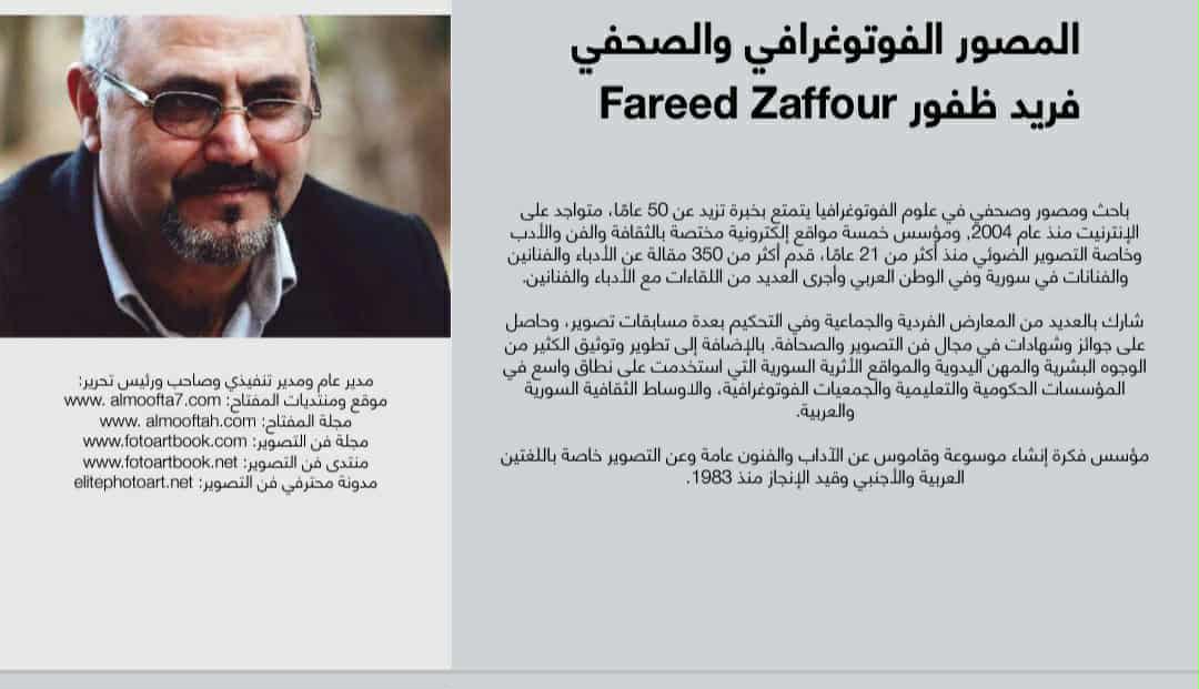 يُعد فريد ظفور من الشخصيات البارزة في عالم التصوير الفوتوغرافي والصحافة الفنية، حيث جمع بين شغف التوثيق البصري والإبداع الصحفي، مقدّمًا إرثًا فنيًا وثقافيًا يثري ذاكرة الفن العربي. على مدى عقود، ساهم في نشر الثقافة التصويرية، وتوثيق الأحداث والمعالم، وتعزيز حضور الفنون البصرية في سورية والعالم العربي.